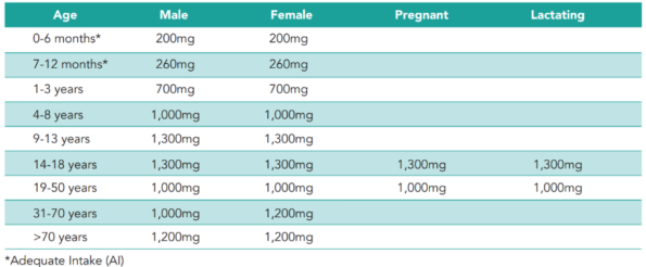 Recommended Dietary Allowances (RDAs) for calcium⁷