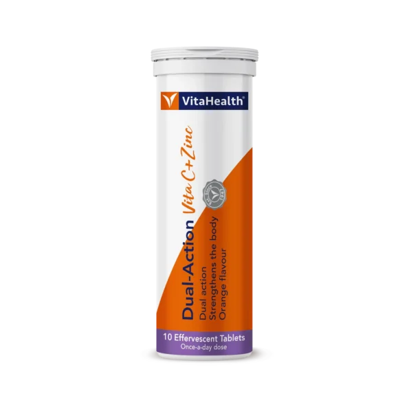VitaHealth Dual Action Vita C + Zinc is an effervescent tablet formulated with a high dose of vitamin C and zinc to boost the body’s immune system and improve general well-being.