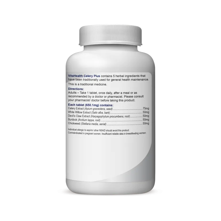 VitaHealth Celery Plus is a proprietary formulation of celery seeds, white willow bark and 3 other valuable herbs. This proprietary formulation of natural herbs which works synergistically to help soothe pain and inflammation. Celery Plus may help prevent degeneration of the affected joints as well as free you from pain. It alleviates pain associated with a certain inflammatory condition such as arthritis and gout. It acts as a diuretic to excrete toxins and uric acid through urine. It helps to reduce inflammation and relieve the symptoms of gout attack.