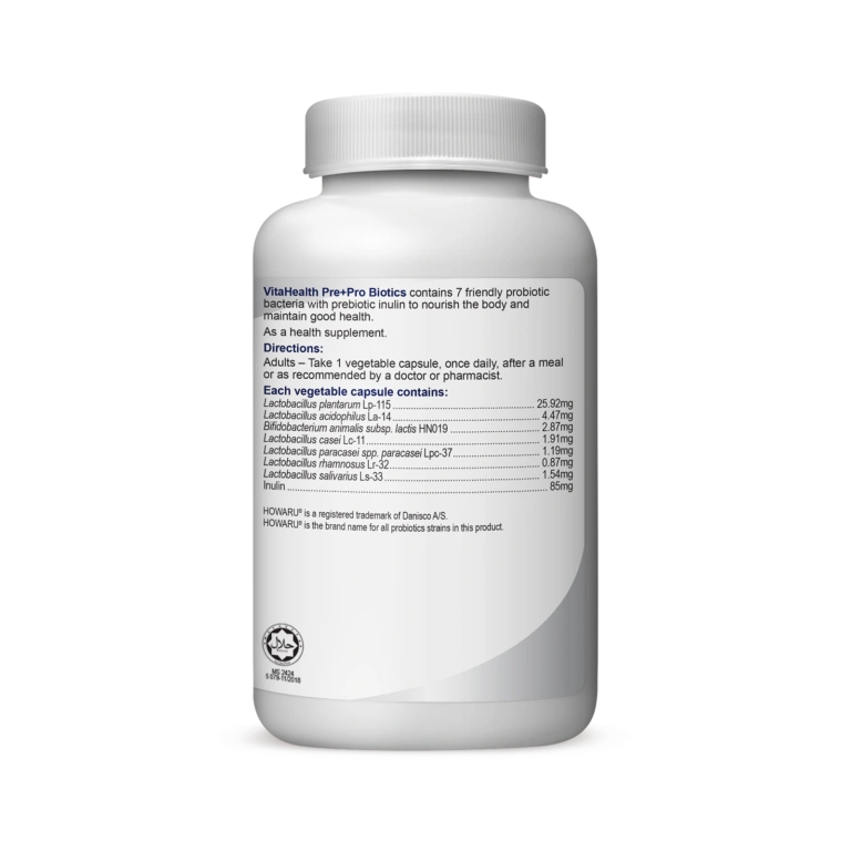 VitaHealth Pre+Pro Biotics is an advanced probiotic formula that combines 7 unique and highly effective strains of beneficial bacteria Lactobacillus and Bifidobacterium that help to promote a healthy balanced gut microflora, improve digestion, and strengthen the immune system.