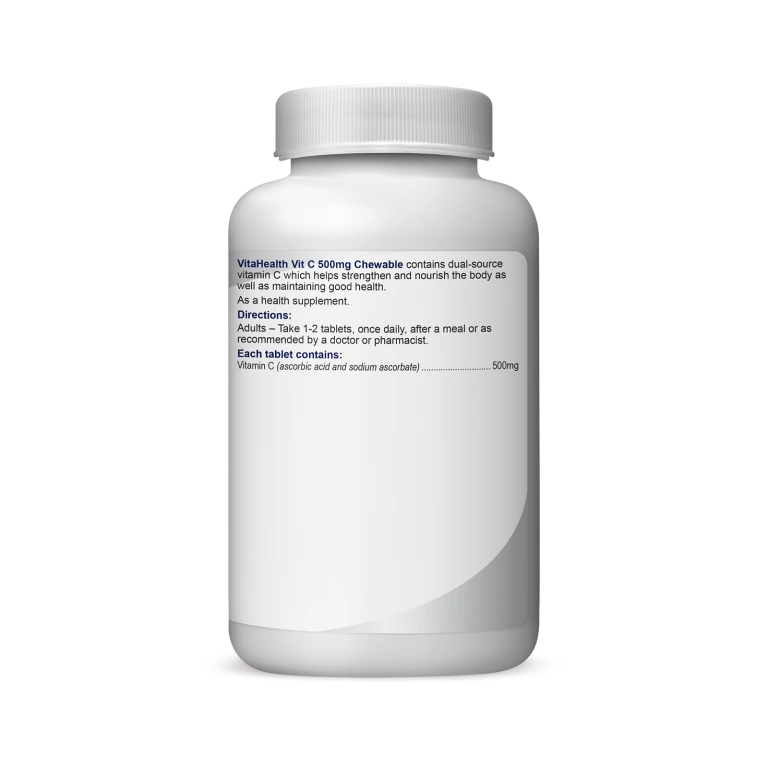 VitaHealth Vit C 500mg Chewable offers the same benefits as regular vitamin C and is ideal for those with a sensitive stomach. It contains dual sources of vitamin C, which are ascorbic acid and sodium ascorbate. This produces a reduced-acid solution that is non-irritating to the stomach and intestinal lining. Vitamin C is well-known as an antioxidant and is helpful to protect the body against free radicals and support the immune system.