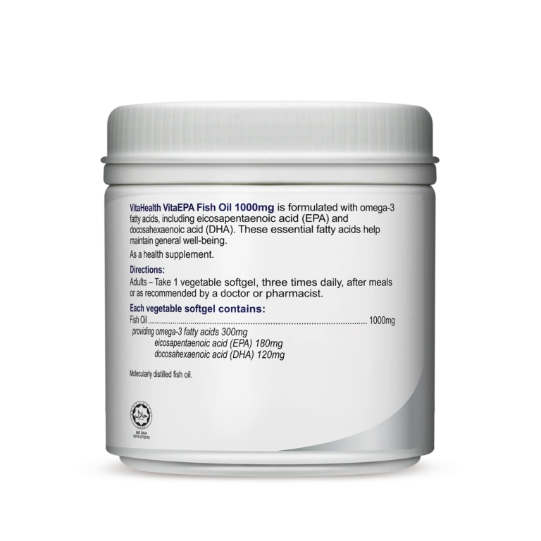 VitaHealth VitaEPA Fish Oil 1000mg is a natural omega-3 marine triglycerides supplement which provides EPA 180mg and DHA 120mg. It is in the true form of natural triglycerides that are molecularly distilled for optimum purity.