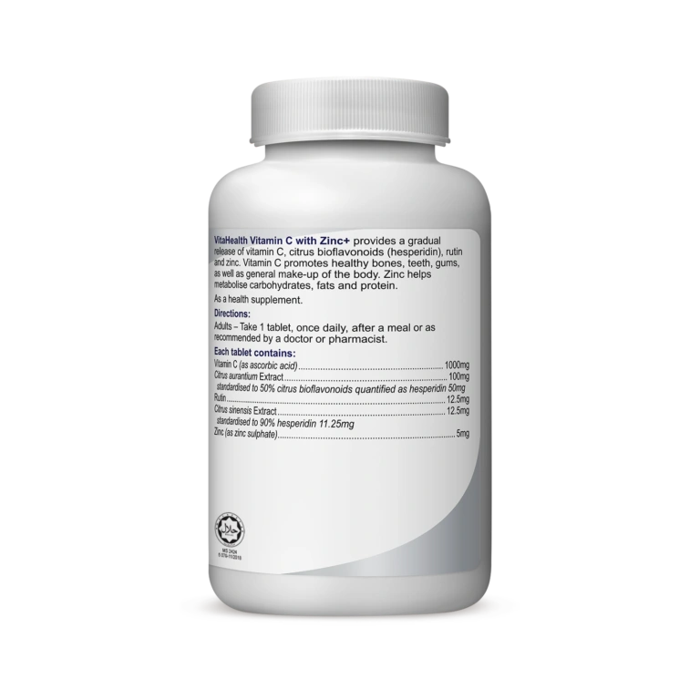 VitaHealth Vitamin C with Zinc+ offers superior antioxidant protection with combined high-strength vitamin C, citrus bioflavonoids, rutin, hesperidin and zinc in a single tablet.